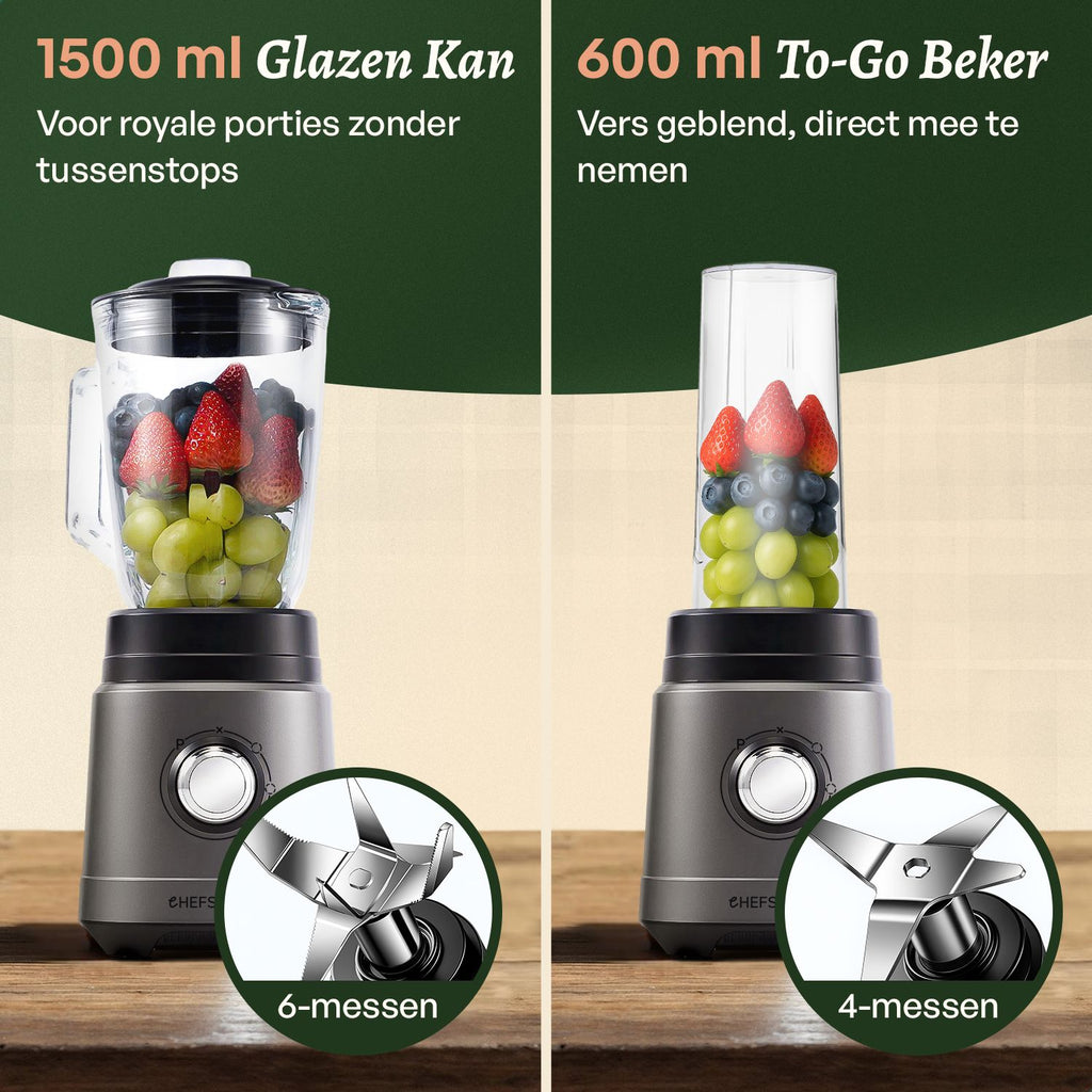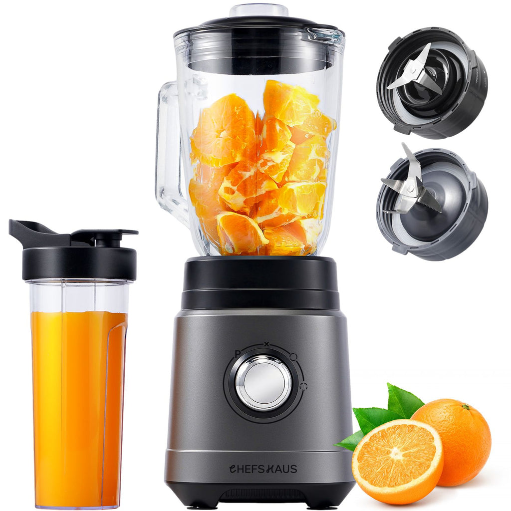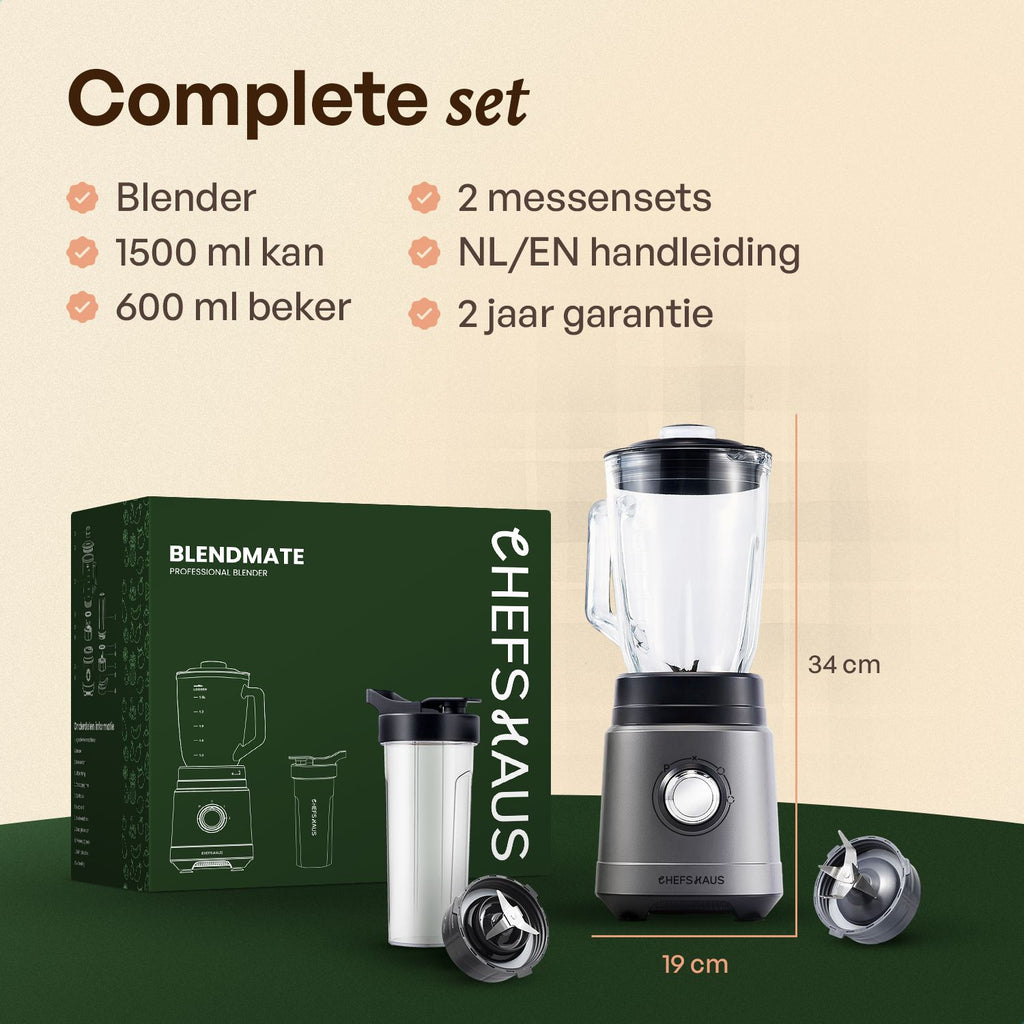 Der CHEFSHAUS Blendmate ist ein hochwertiger Mixer mit leistungsstarkem Motor , der für müheloses Arbeiten entwickelt wurde Eiscreme, Nüsse und gefrorene Früchte zur Verarbeitung. Dank der robuster 1,5-Liter-Glaskrug und die 700-ml-BPA-freier To-Go-Becher Genießen Sie perfekt gemixte Smoothies und Shakes zu Hause und unterwegs. Der Blendmate ist leise, stabil und leicht zu reinigen Alle Komponenten sind spülmaschinenfest. Entscheiden Sie sich für Leistung, Qualität und Benutzerfreundlichkeit mit dem CHEFSHAUS Blendmate.
