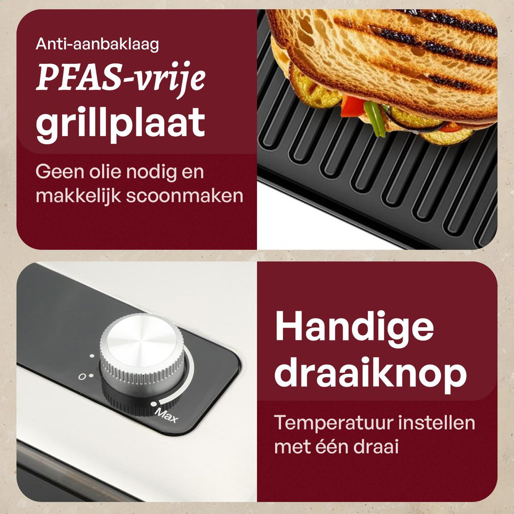 • Zwevende bovenplaat: Grilt gelijkmatig zonder je broodjes of burgers plat te drukken.