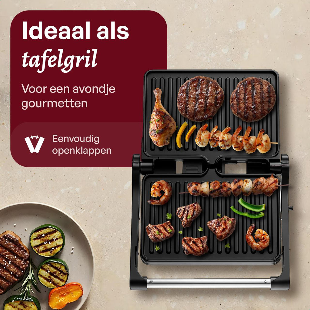 • 180° uitklapbaar: Zet hem open als tafelgrill – ideaal voor een snelle maaltijd of een gezellige avond.