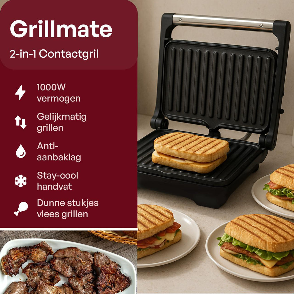 Grillmate - Grill Aparaat - Tosti Apparaat - Contactgrill - Tosti IJzer met grillplaat - Anti-Aanbaklaag - PFAS vrij - 180° Uitklapbaar - Cool Touch - Panini Grill / Croque Monsieur Toestel