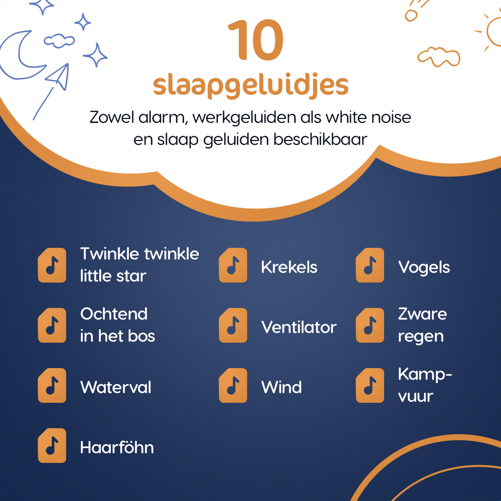 De LUSQ® Starry beschikt over tien verschillende wekkergeluiden, zodat je het ontwaken kunt aanpassen aan de voorkeur van je kind.