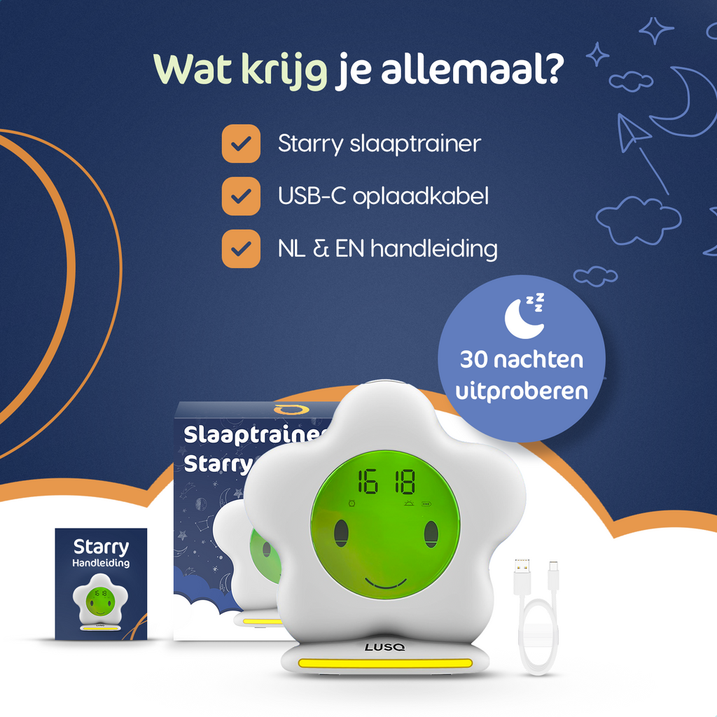 Vroege ochtenden, onrustige nachten en terugkerende vragen als “mag ik al opstaan?” behoren tot het verleden. Met de LUSQ® Starry creëer je eenvoudig een consistent slaapritme dat kinderen houvast geeft en ouders meer rust.